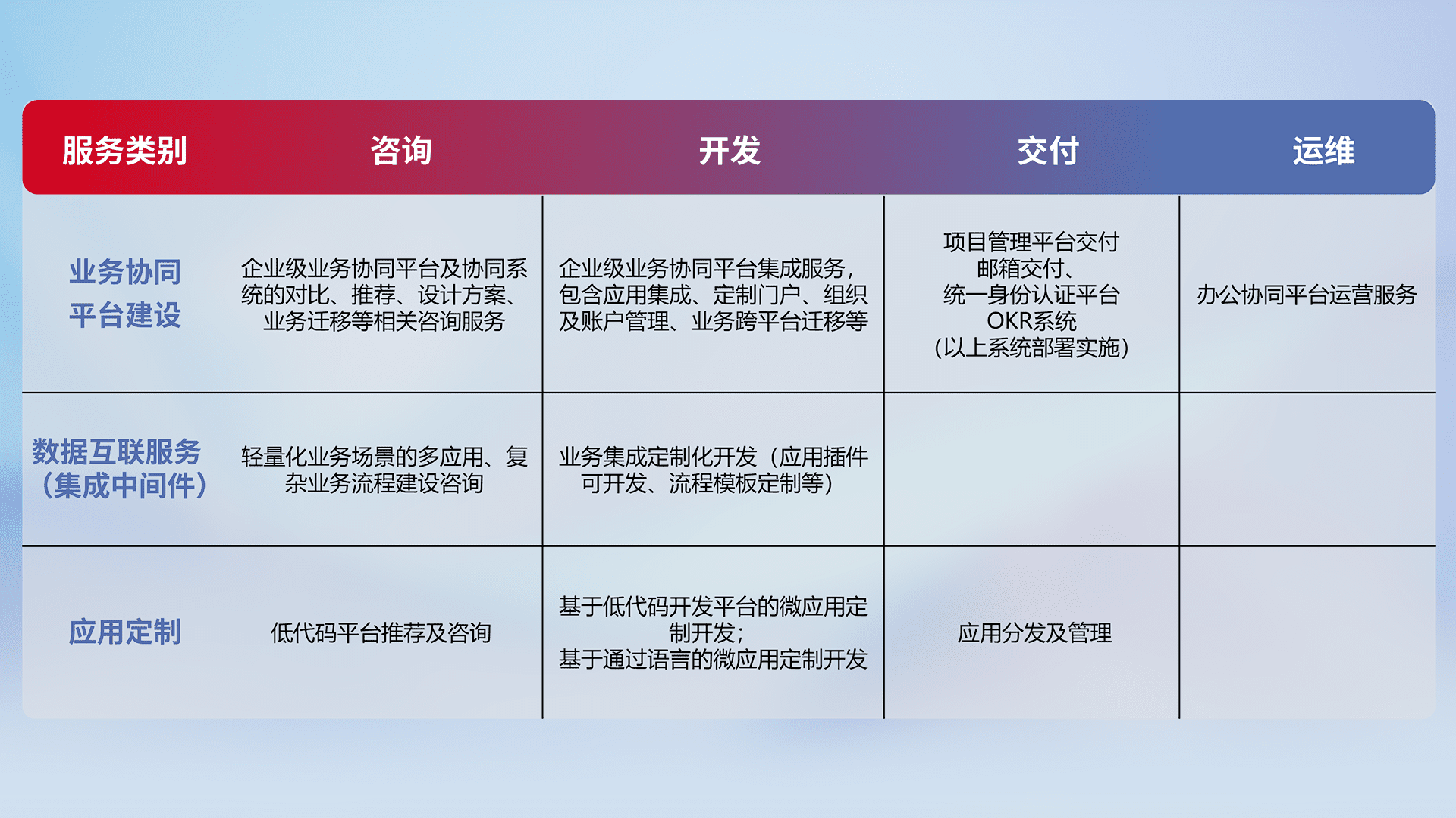 针对钉钉、、、企微、、、IDaas等平台级产品提供产品的规划、、方案、、交付、、、定制化开发等服务,,,实现如统一协同办公、、智能客户服务、、、、混合会议管理、、、、智能数据查询、、、等业务场景,,,实现数字化转型。。。。
