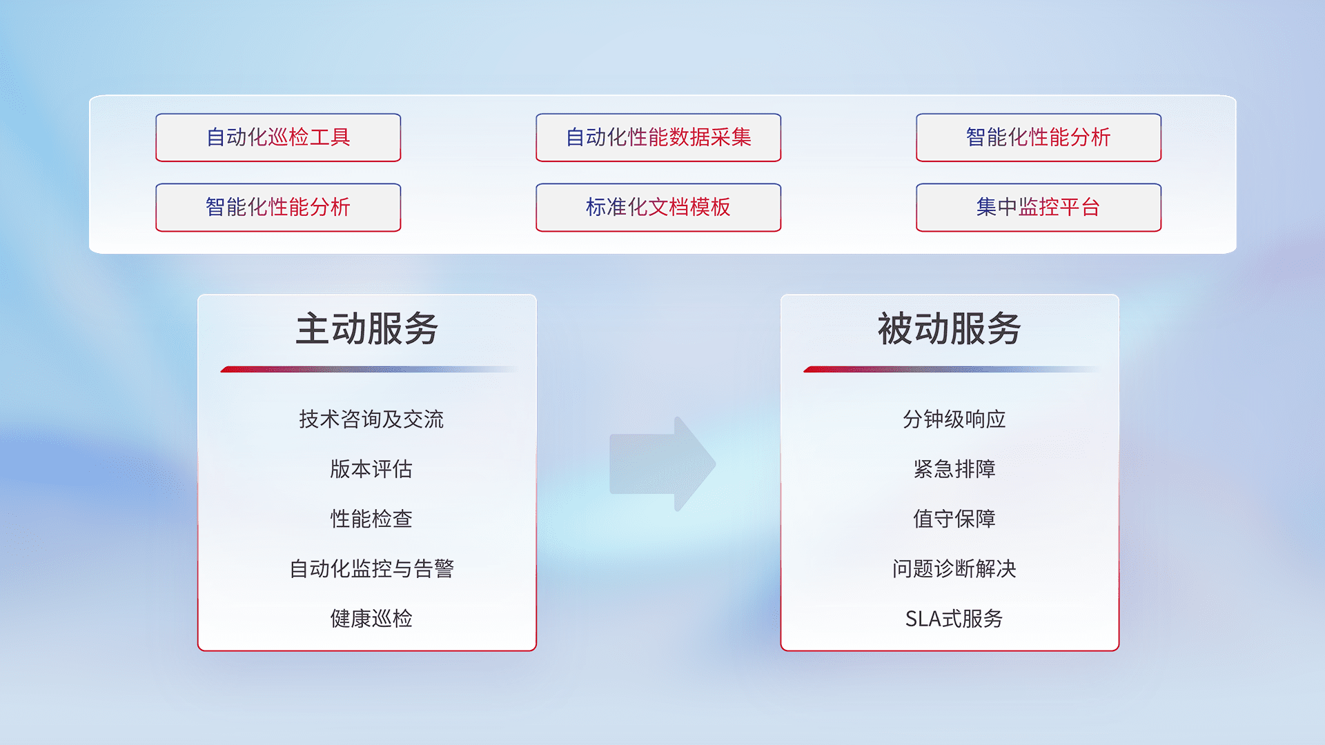 智能化工具和标准化文档,,保障服务质量,,,提供主动服务(包含技术咨询、、版本评估、、、、性能检查、、自动化监控与告警、、健康巡检)和被动服务包含(分钟级响应、、、紧急排障、、、、值守保障、、、、问题诊断解决、、、SLA服务)。。。